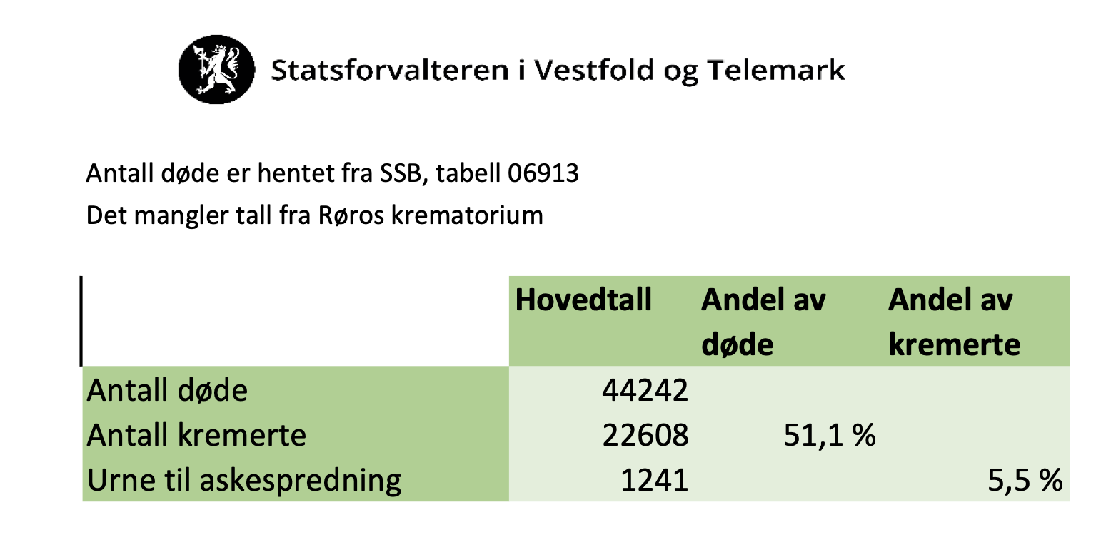 Kremasjonsstatistikken for 2024 er nå klar. Dere finner statistikker fra 2024 og mange år tilbake her: kremasjonsstatistikk.